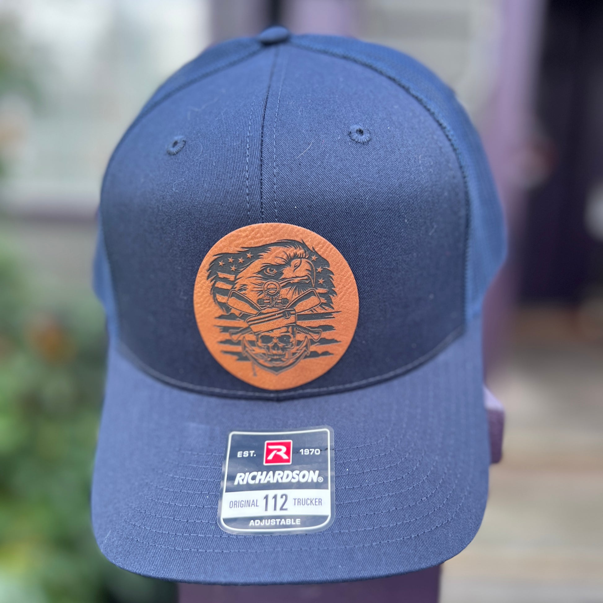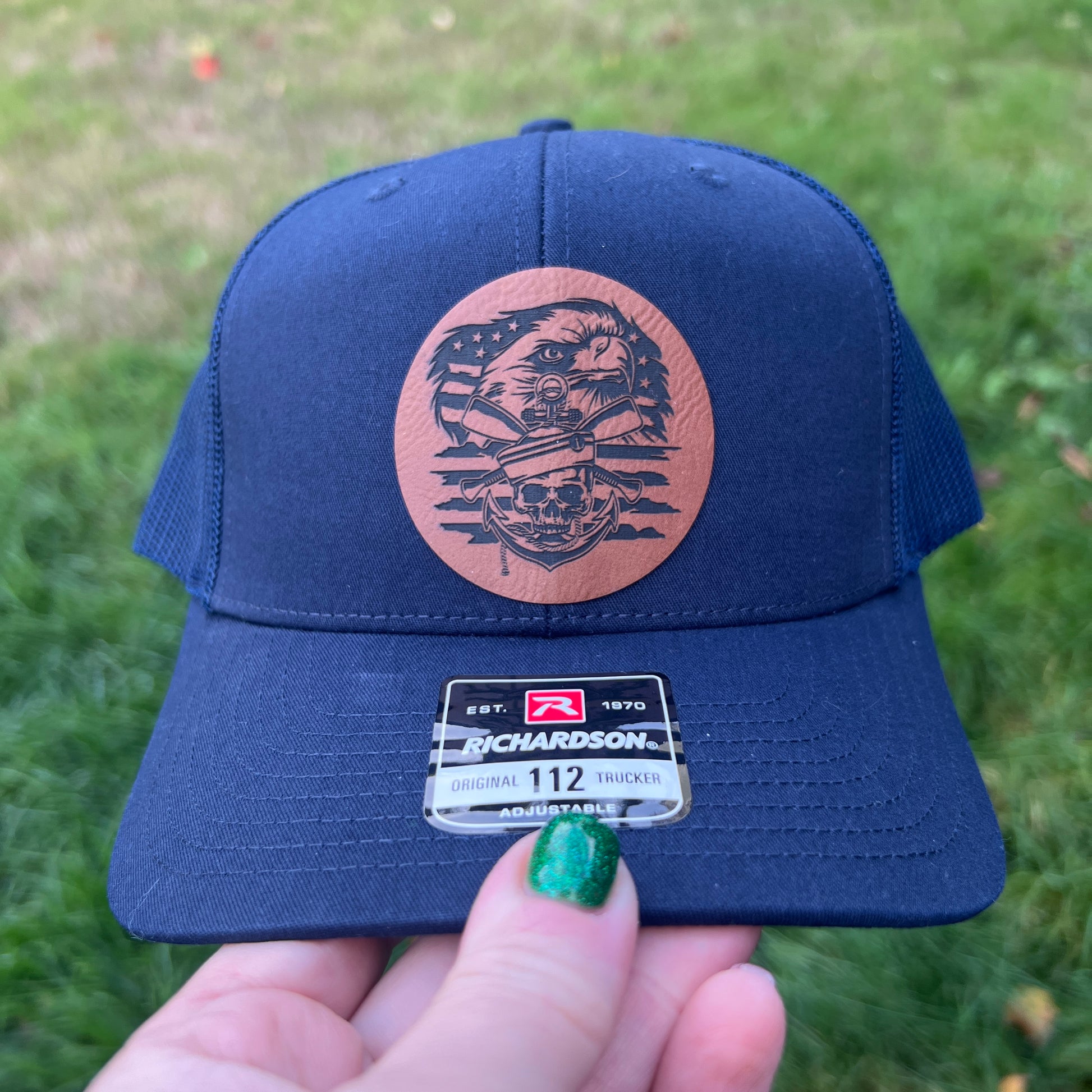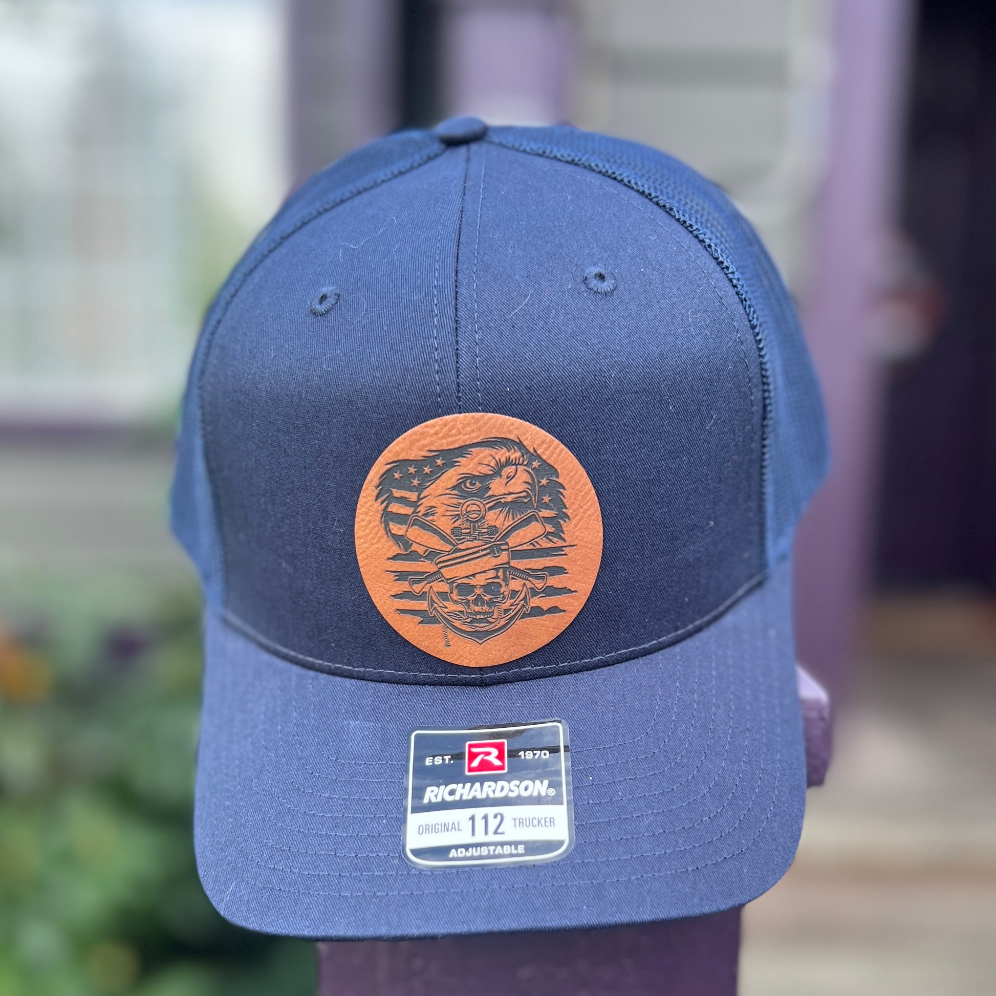 This listing is for a Navy/Navy Richardson 112 Trucker Hat with rawhide leather patch.