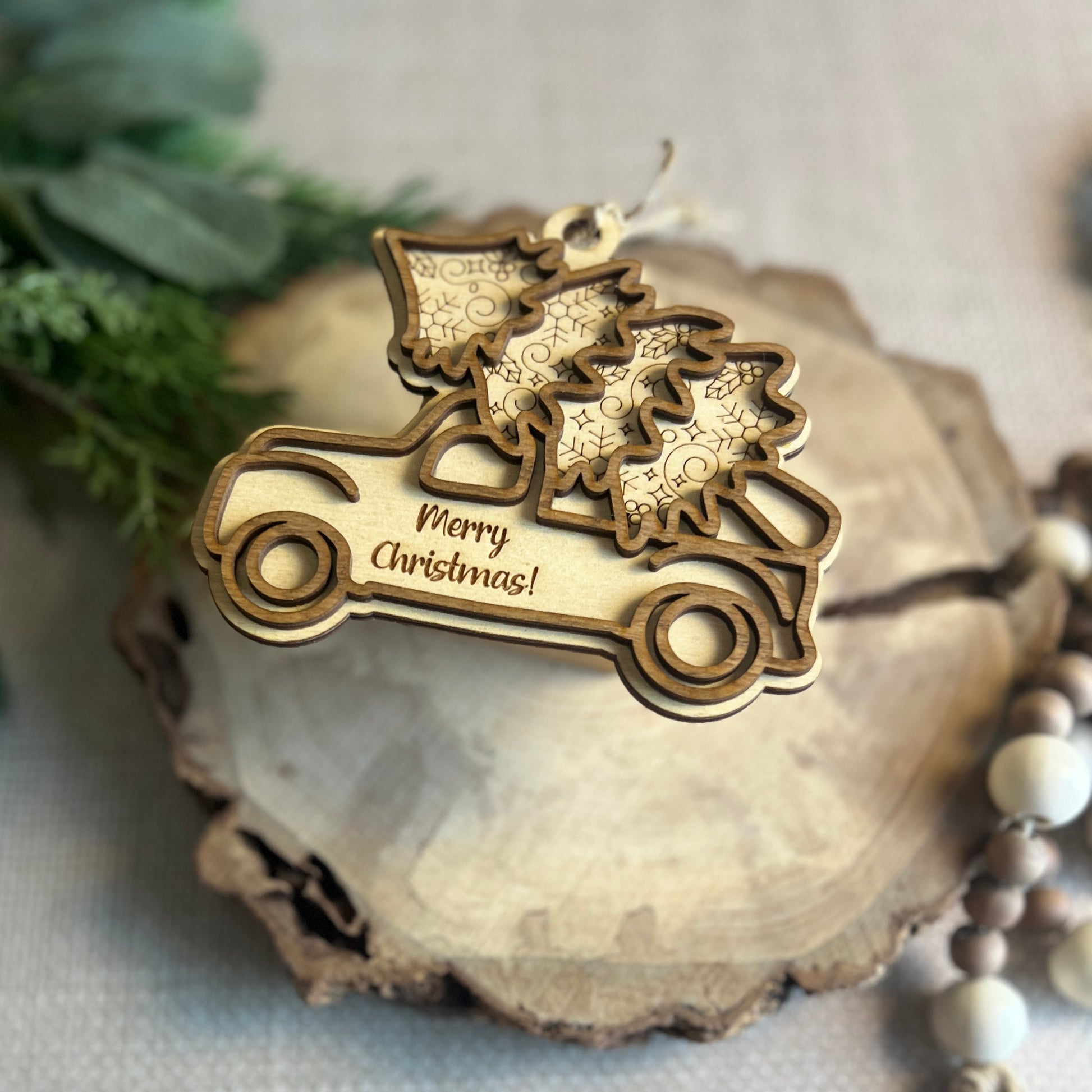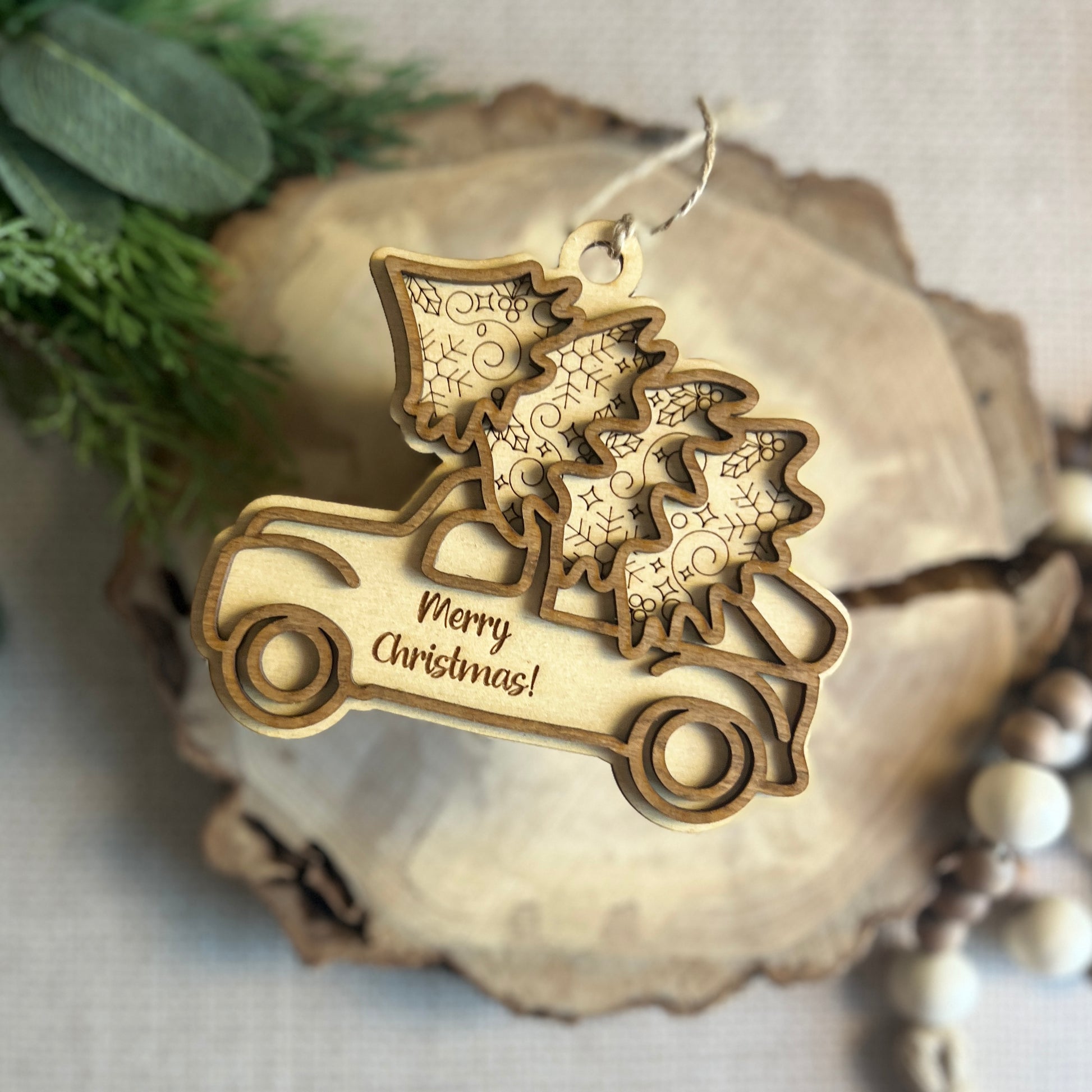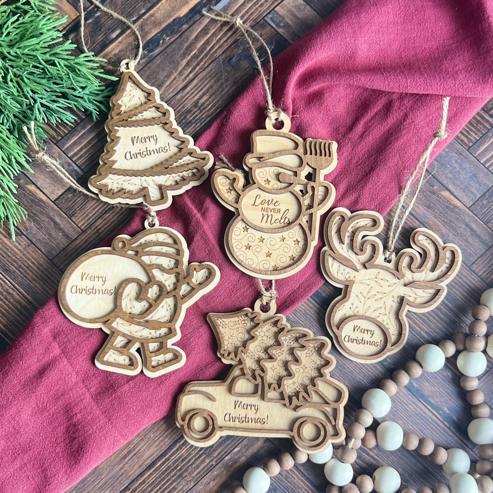 These beautiful double-layer wooden ornaments are perfect for topping a gift or tucking into a stocking. After gifting, they make a lovely keepsake to hang on the tree for years to come. The back layer features a natural wood finish with a delicate design, while the top layer is stained to add a rich, elegant touch.