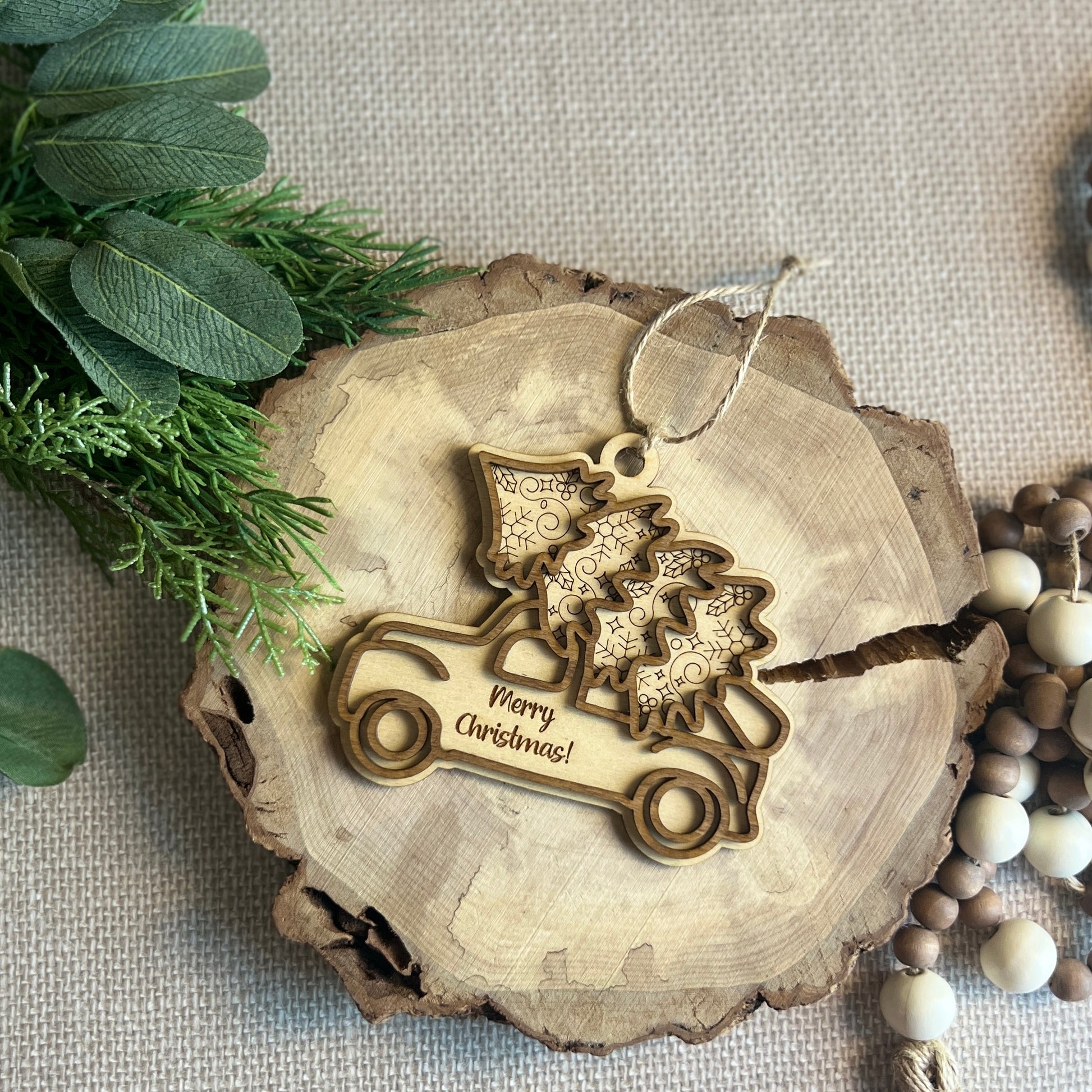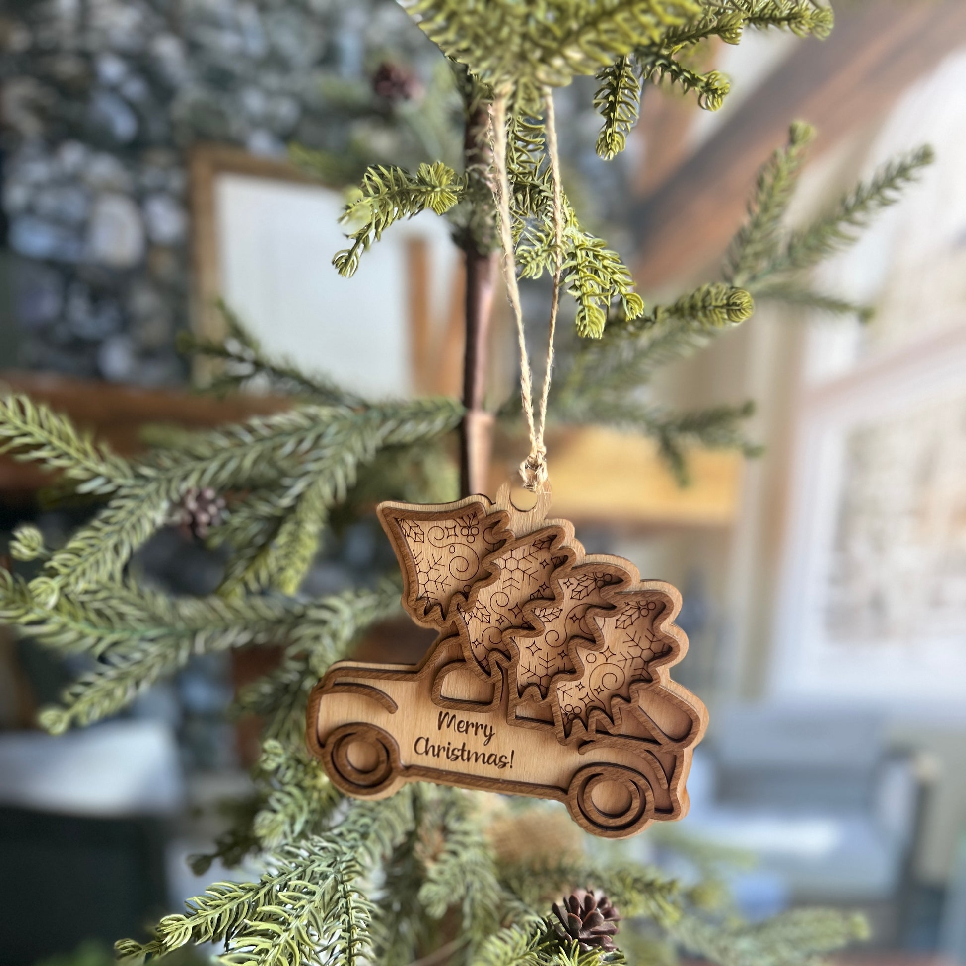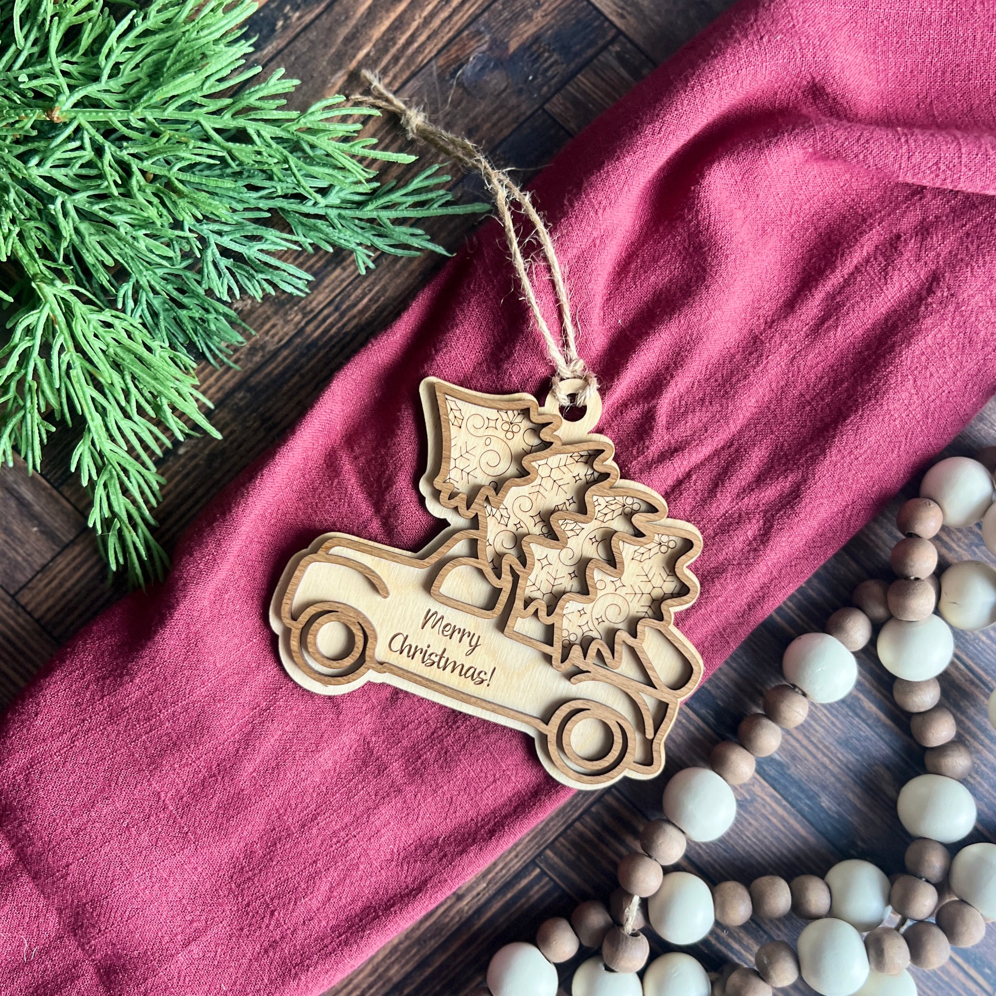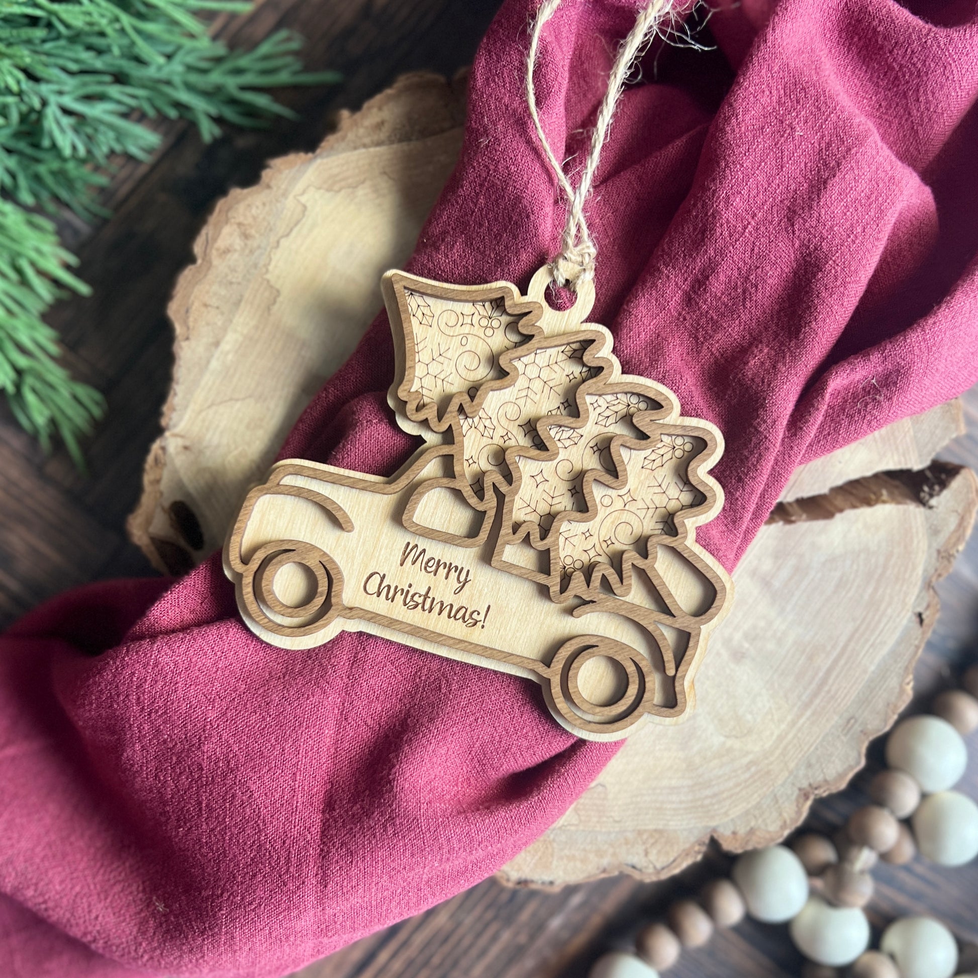 These beautiful double-layer wooden ornaments are perfect for topping a gift or tucking into a stocking. After gifting, they make a lovely keepsake to hang on the tree for years to come. The back layer features a natural wood finish with a delicate design, while the top layer is stained to add a rich, elegant touch.