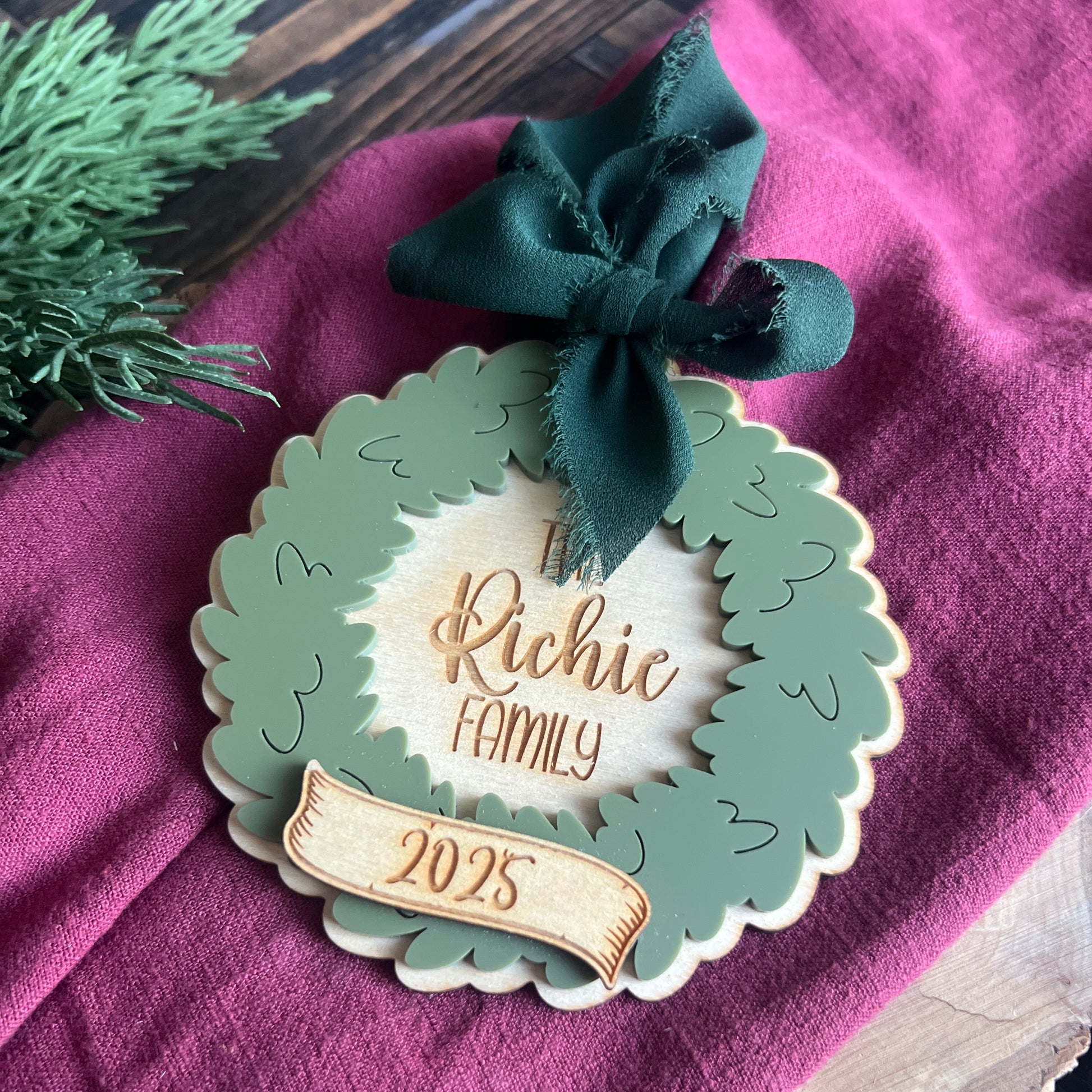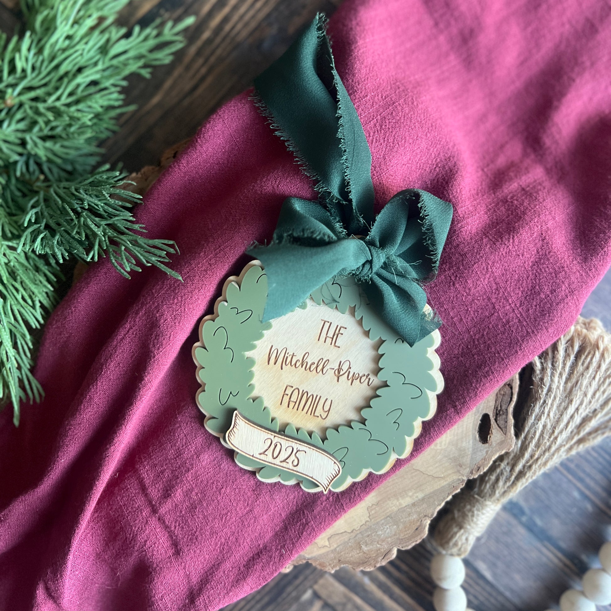 This beautiful two-layer Family Wreath Christmas Ornament makes a thoughtful gift for every family on your list this holiday season. Crafted from durable acrylic and plywood, it’s accented with a delicate fringe chiffon ribbon and personalized with the family name and year. This charming ornament is sure to become a cherished keepsake for years to come.