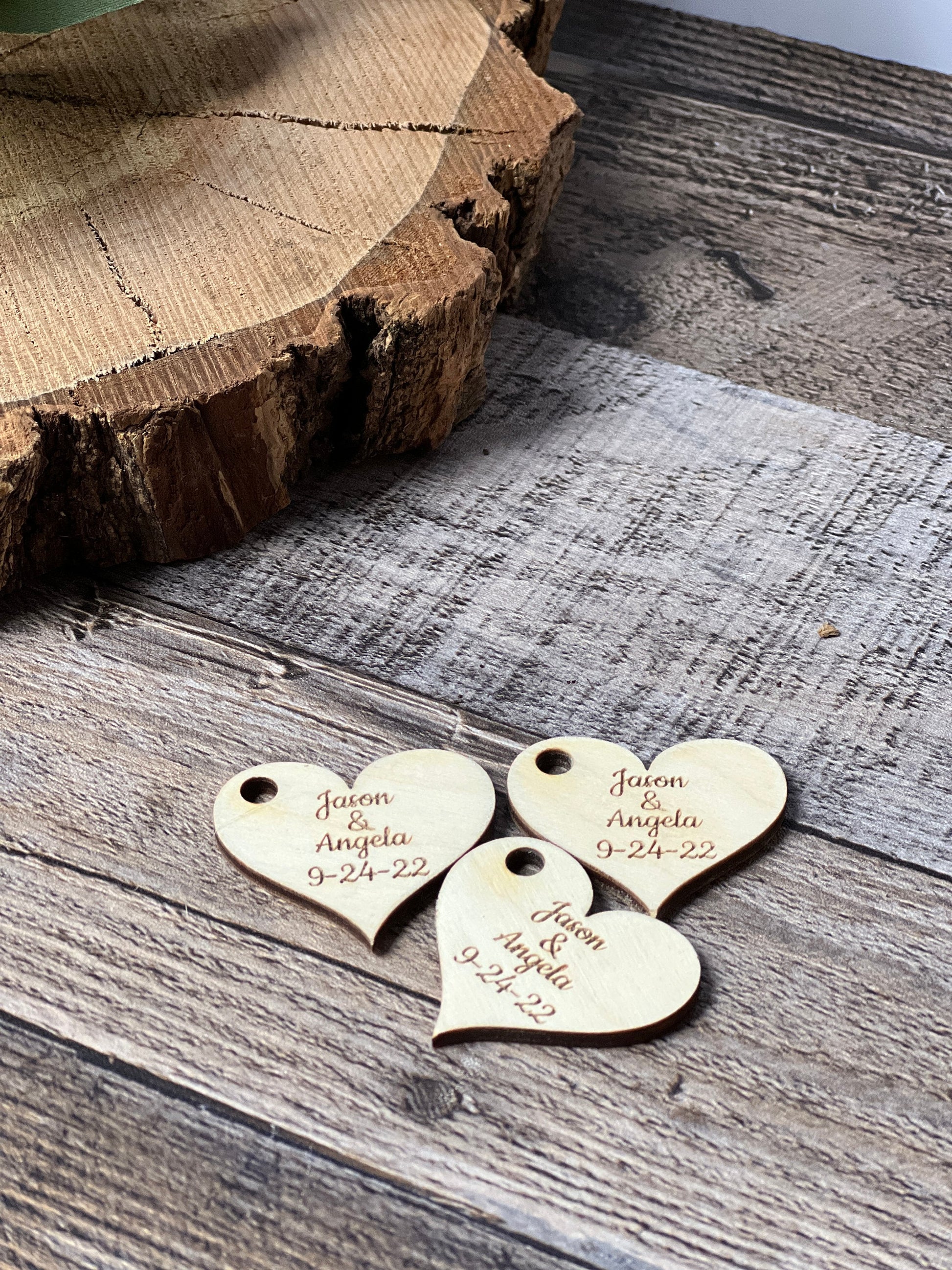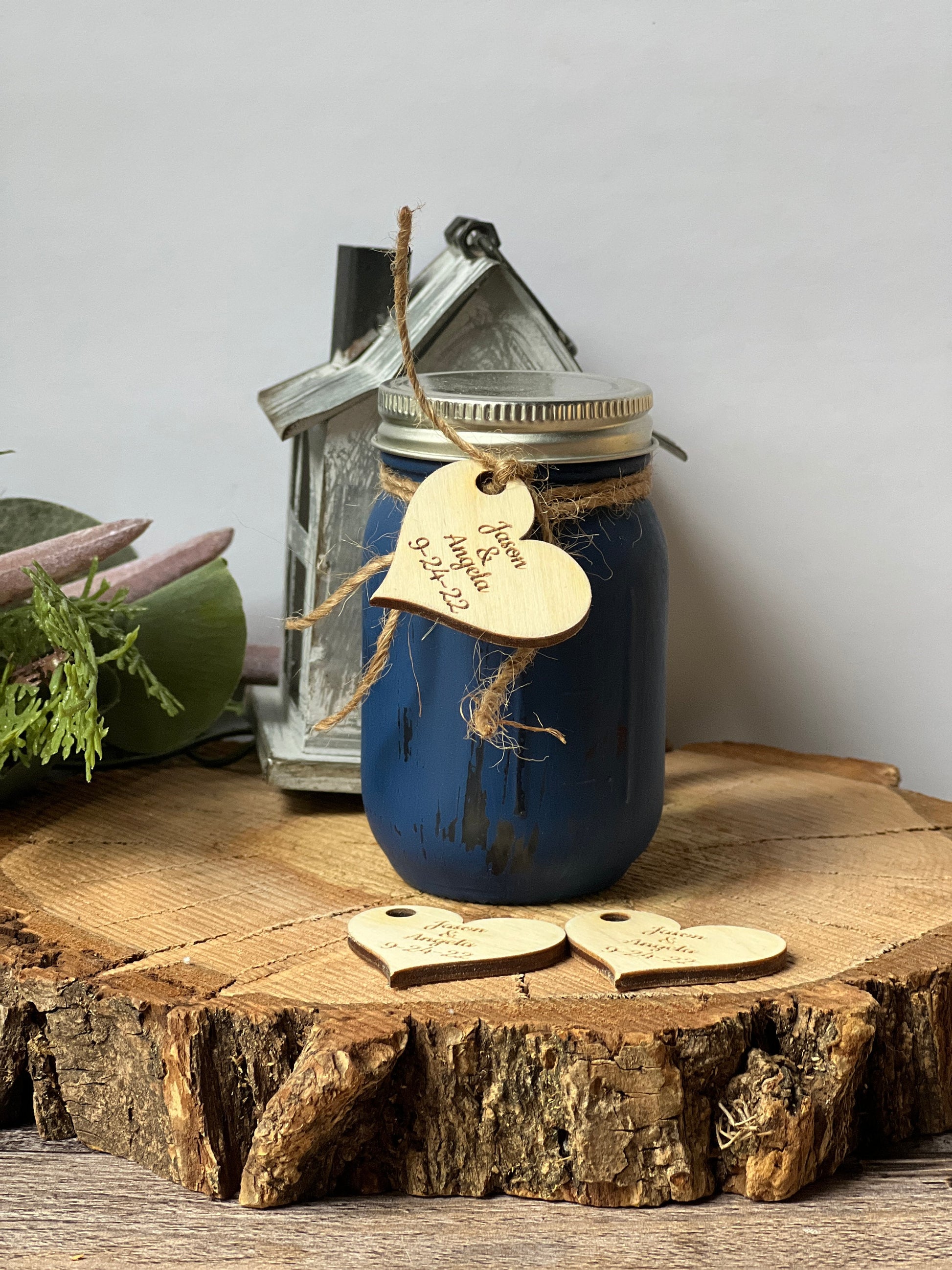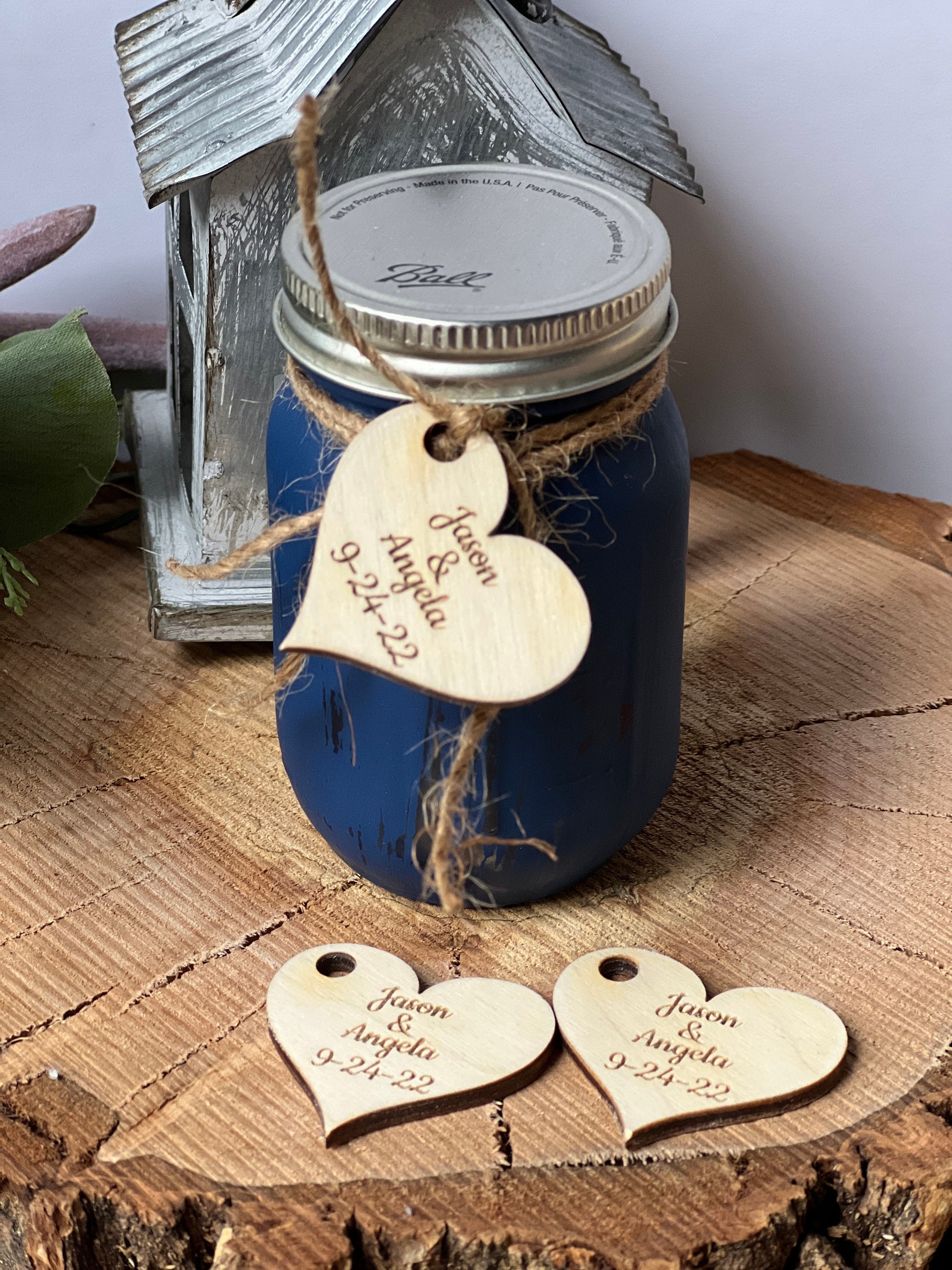 These rustic wedding favors are the perfect as thank you gifts for your wedding guest gifts. Each little wedding thank you favor tag is 1.5" x 1.36" and is laser engraved and cut on plywood with a matte finish and small hole to use for attaching ribbon or jute. Your guests will love these little wedding favours to remember your special day. (Little blue jar is not inclued in the listing. Only the heart shape tags)