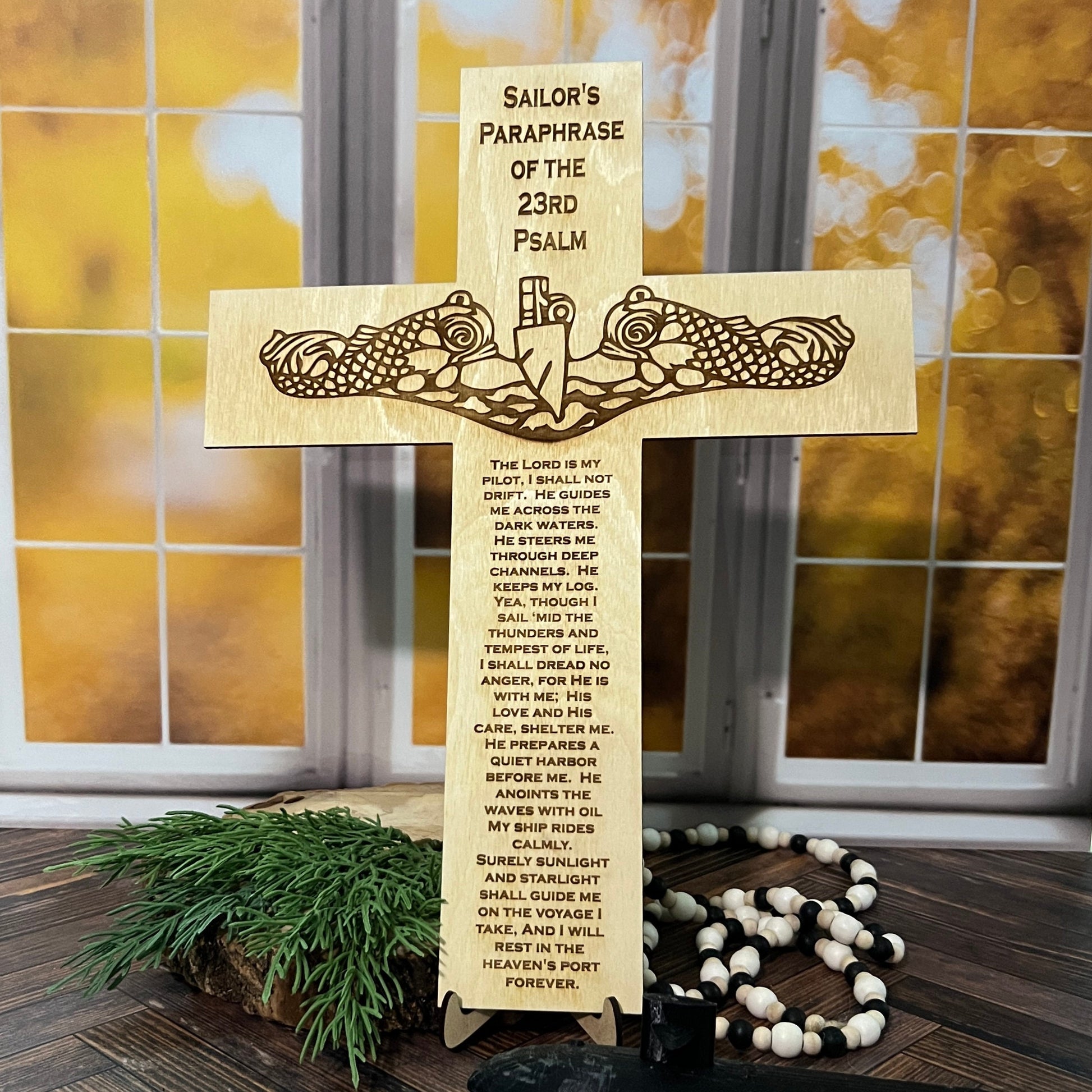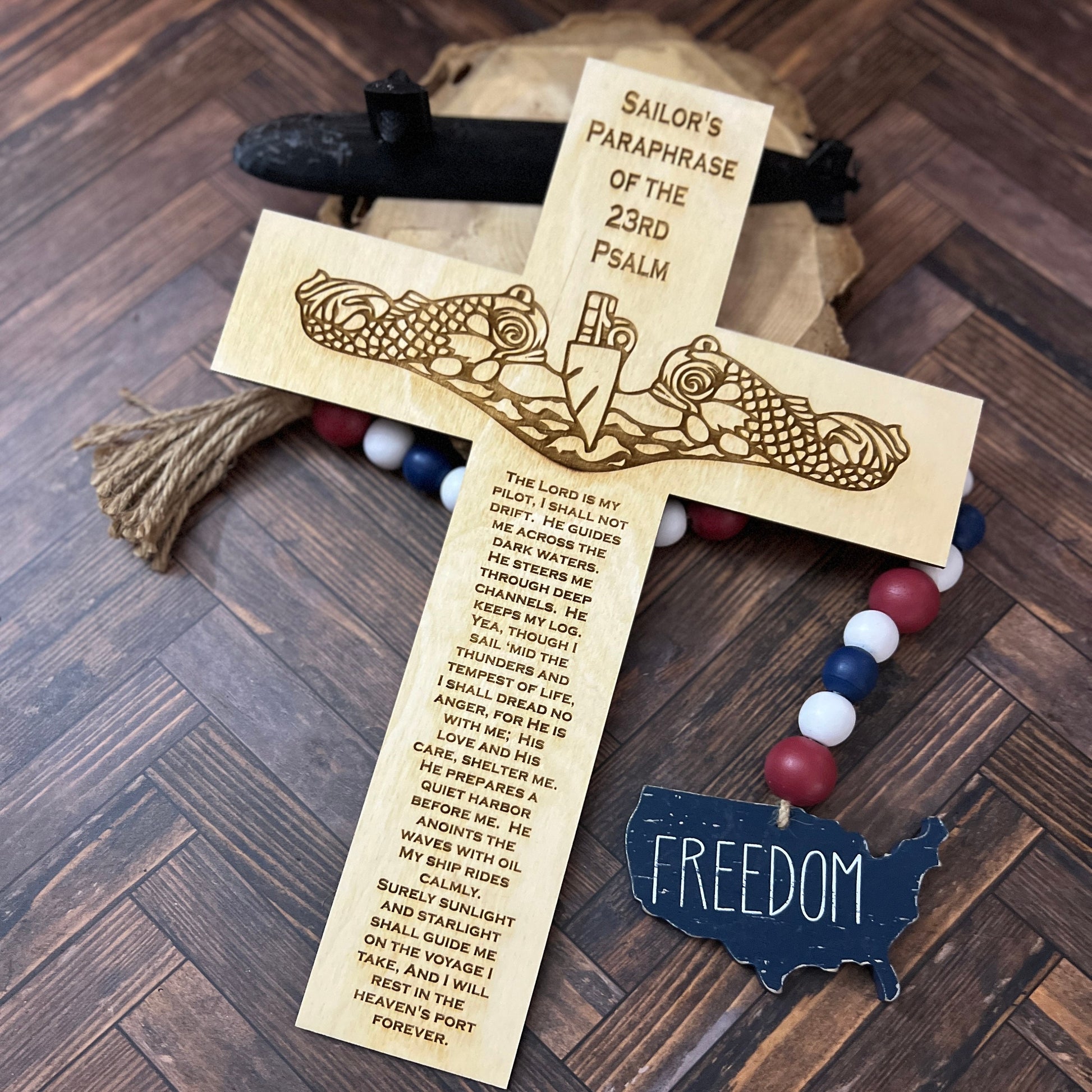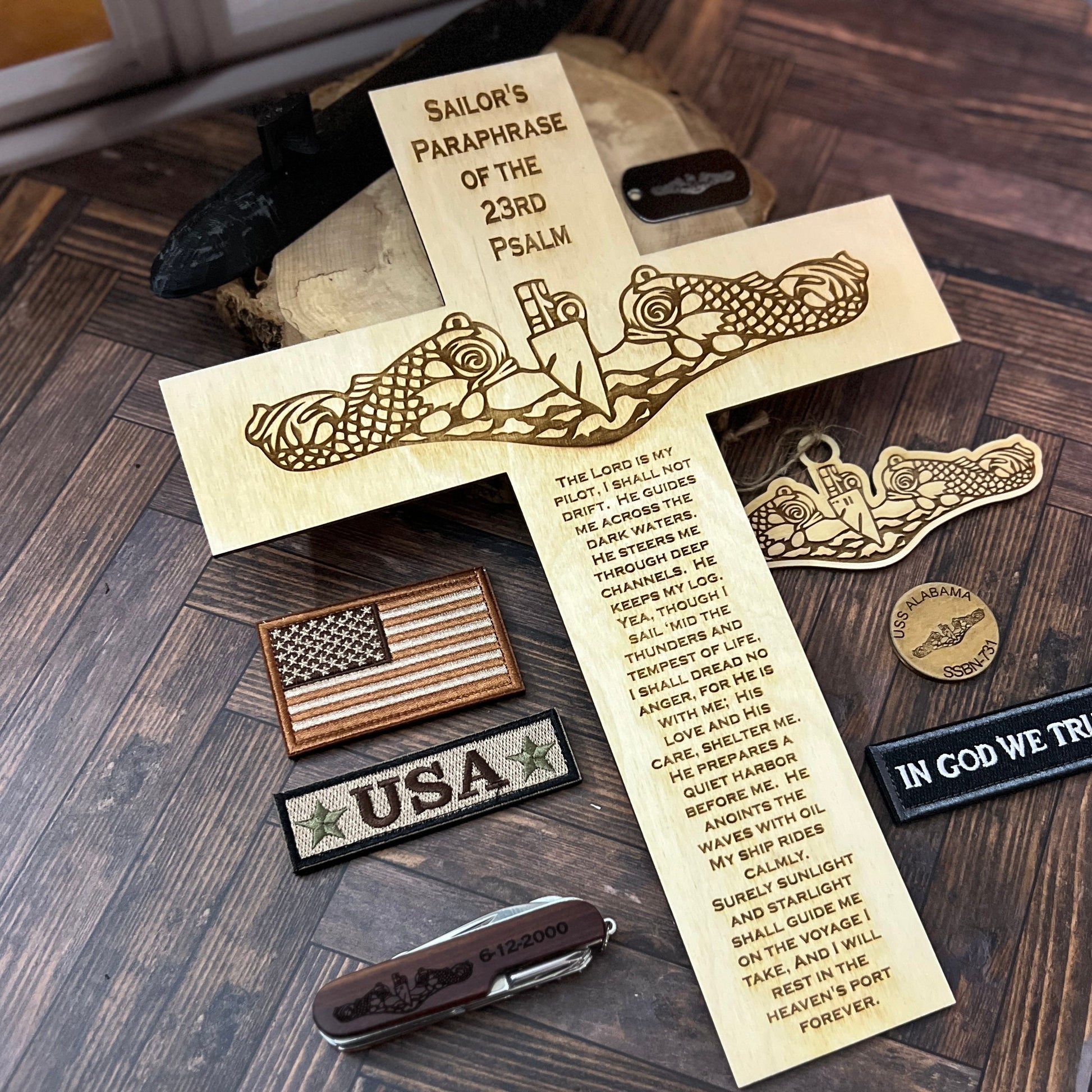 This laser engraved wooden submarine warfare cross with the Psalm 23 makes a great Navy Retirement Gift for your favorite Submariner Veteran. This cross is laser cut out with a set of dolphins and the Paslm 23 engraved on it.