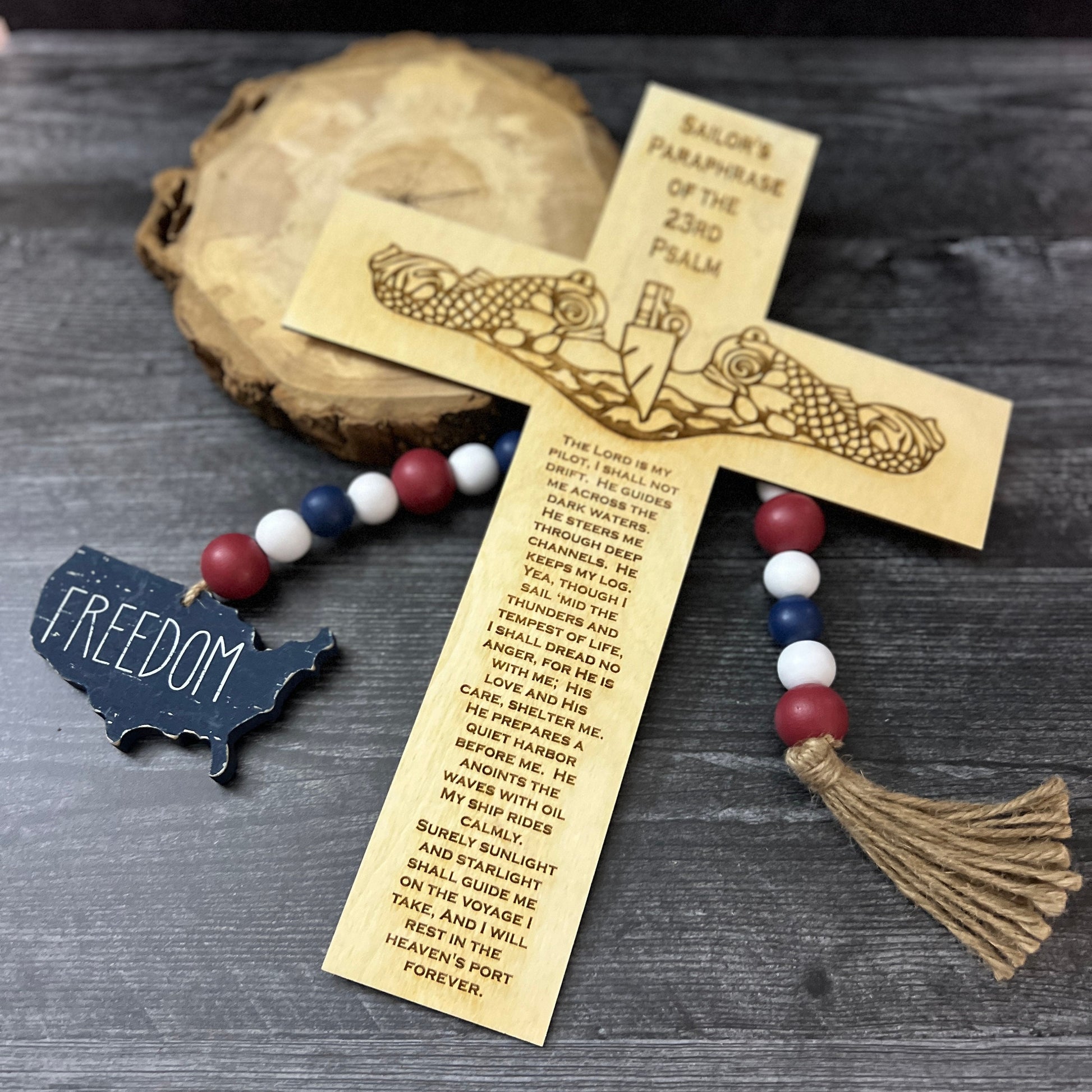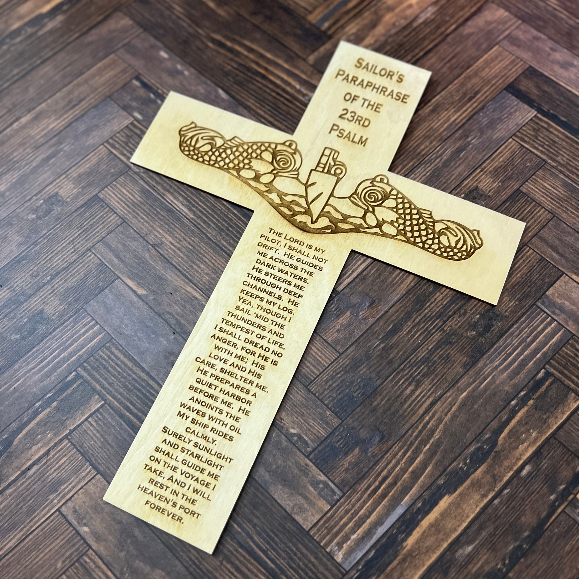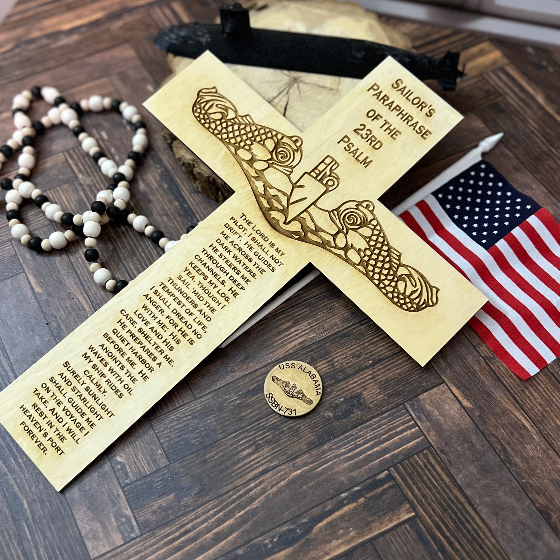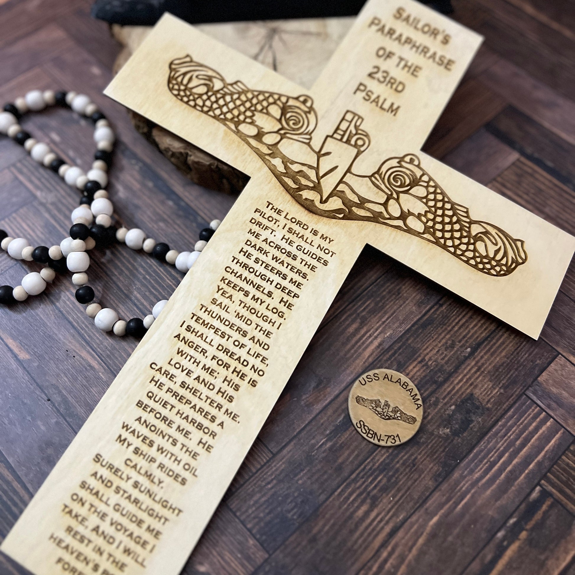 This laser engraved wooden submarine warfare cross with the Psalm 23 makes a great Navy Retirement Gift for your favorite Submariner Veteran. This cross is laser cut out with a set of dolphins and the Paslm 23 engraved on it.