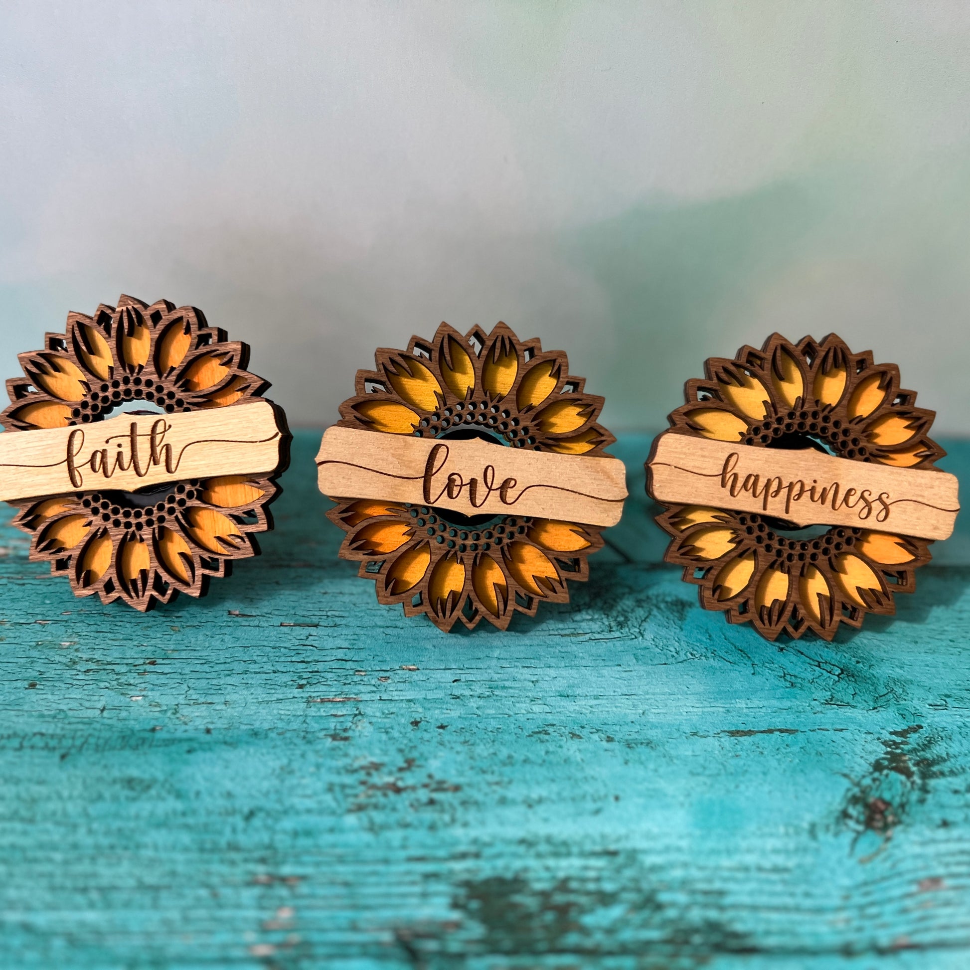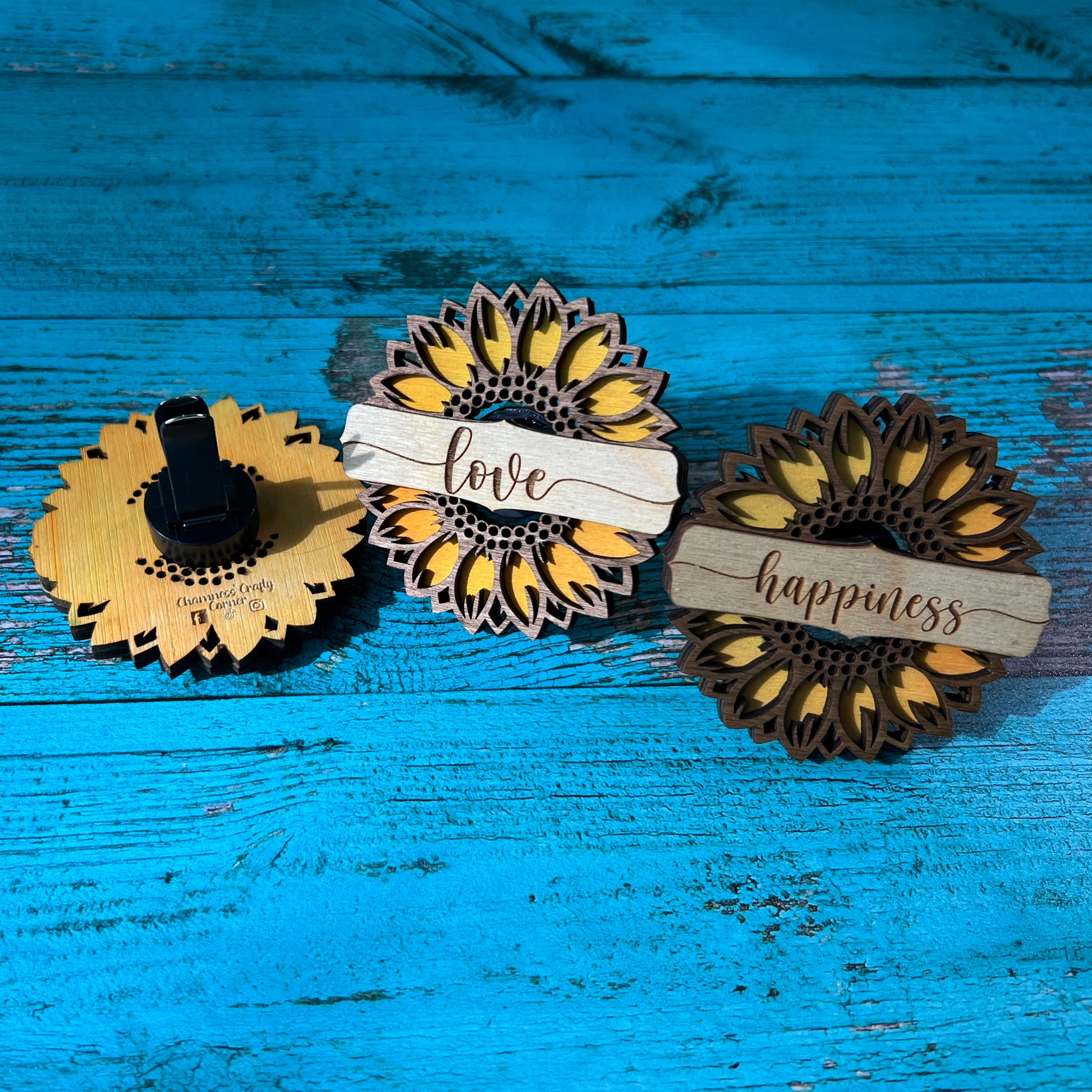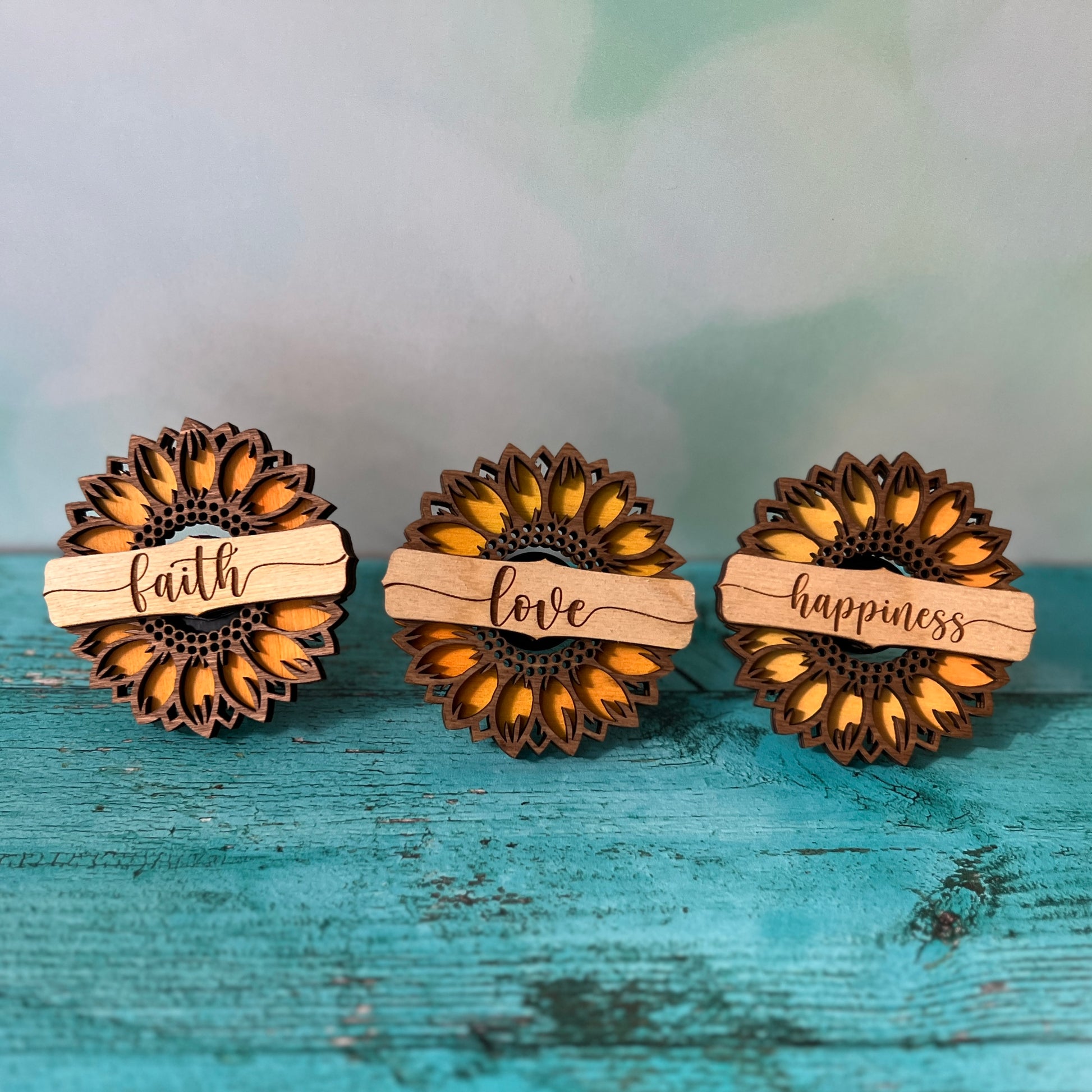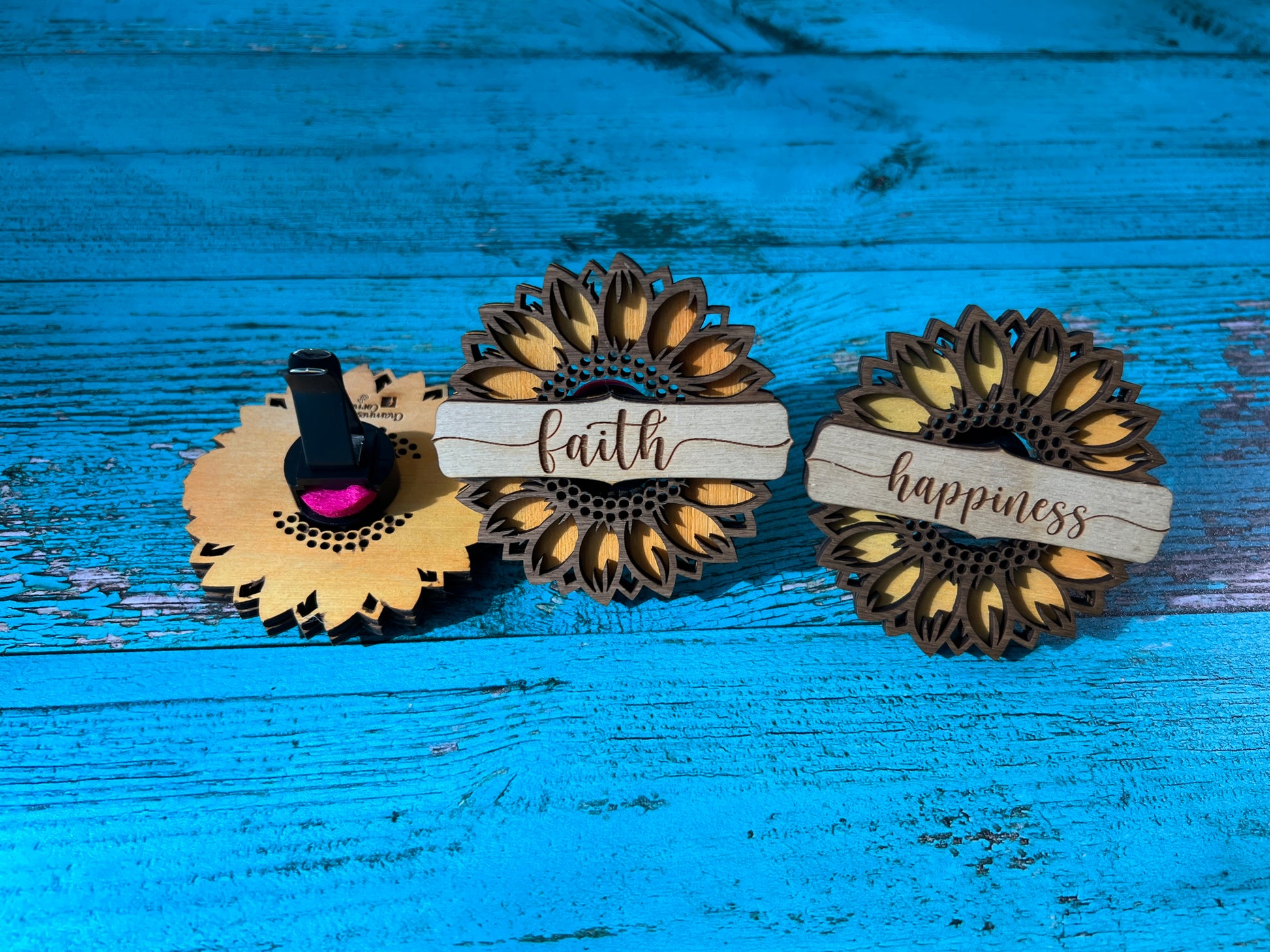 This adorable sunflower car freshies are the prefect birthday gift for your best friend a gift this year. These car accessories are a prefect reminder of summer fun events with their bright yellow color! Each sunflower is 3 layers of wood with the top layer a natural finish with the word of your choice engraved, next layer is stained and bottom layer varies between stain or paint.