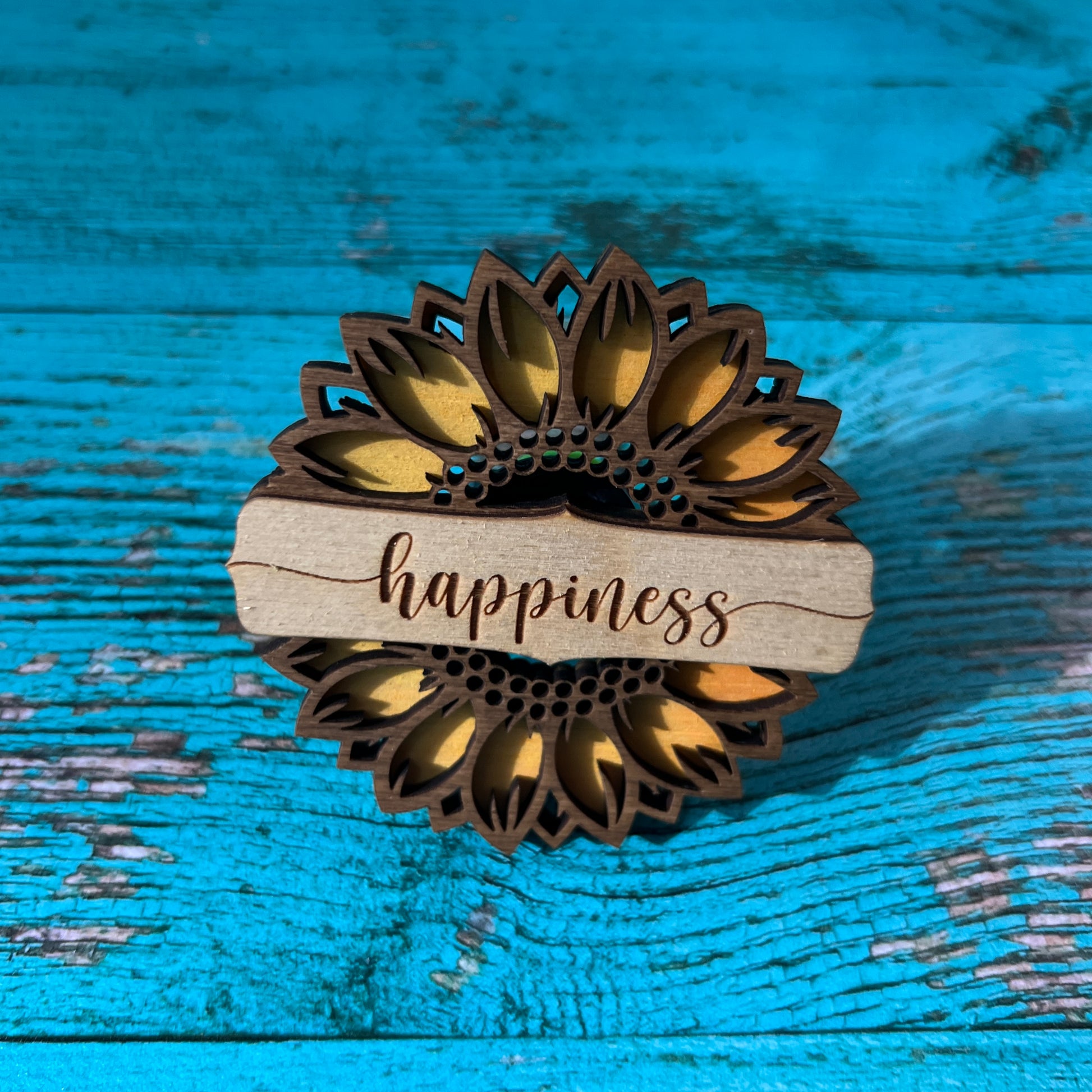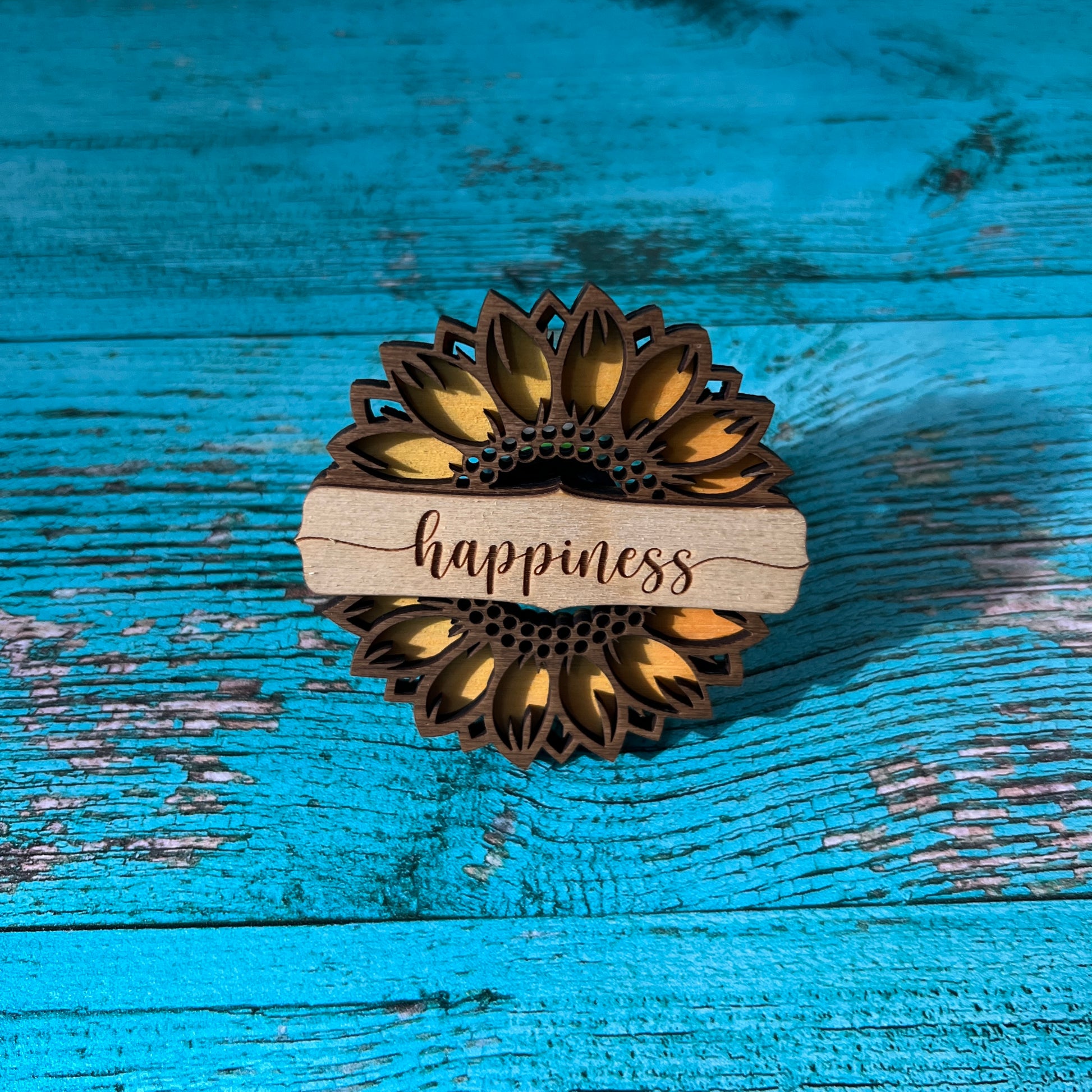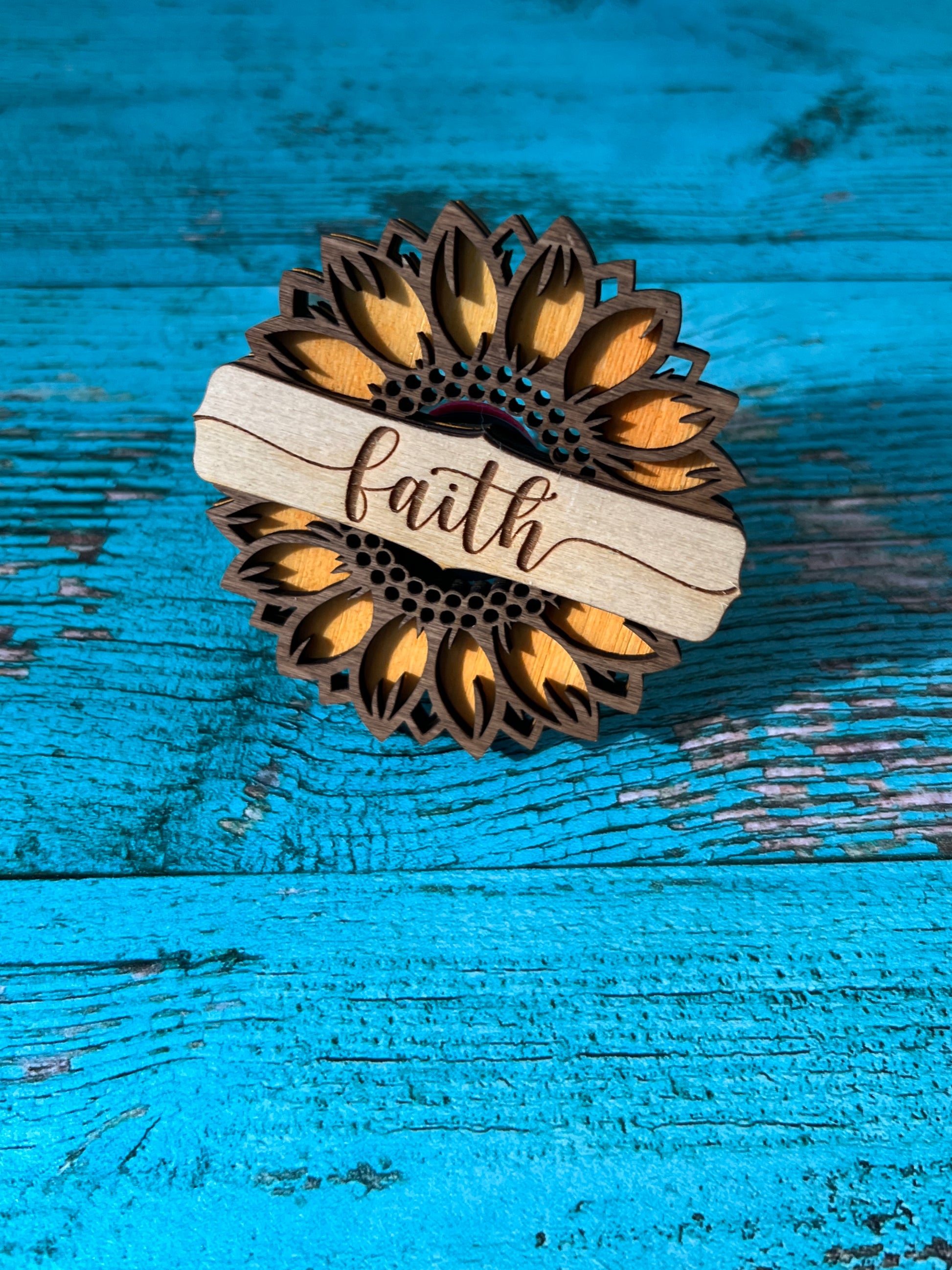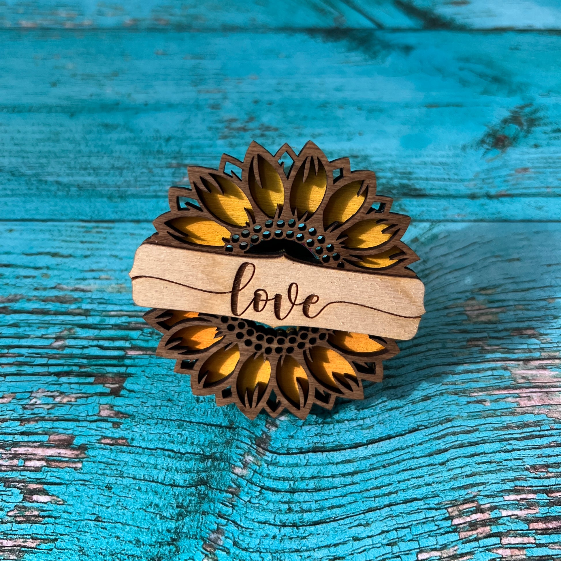 This adorable sunflower car freshies are the prefect birthday gift for your best friend a gift this year. These car accessories are a prefect reminder of summer fun events with their bright yellow color! Each sunflower is 3 layers of wood with the top layer a natural finish with the word of your choice engraved, next layer is stained and bottom layer varies between stain or paint.