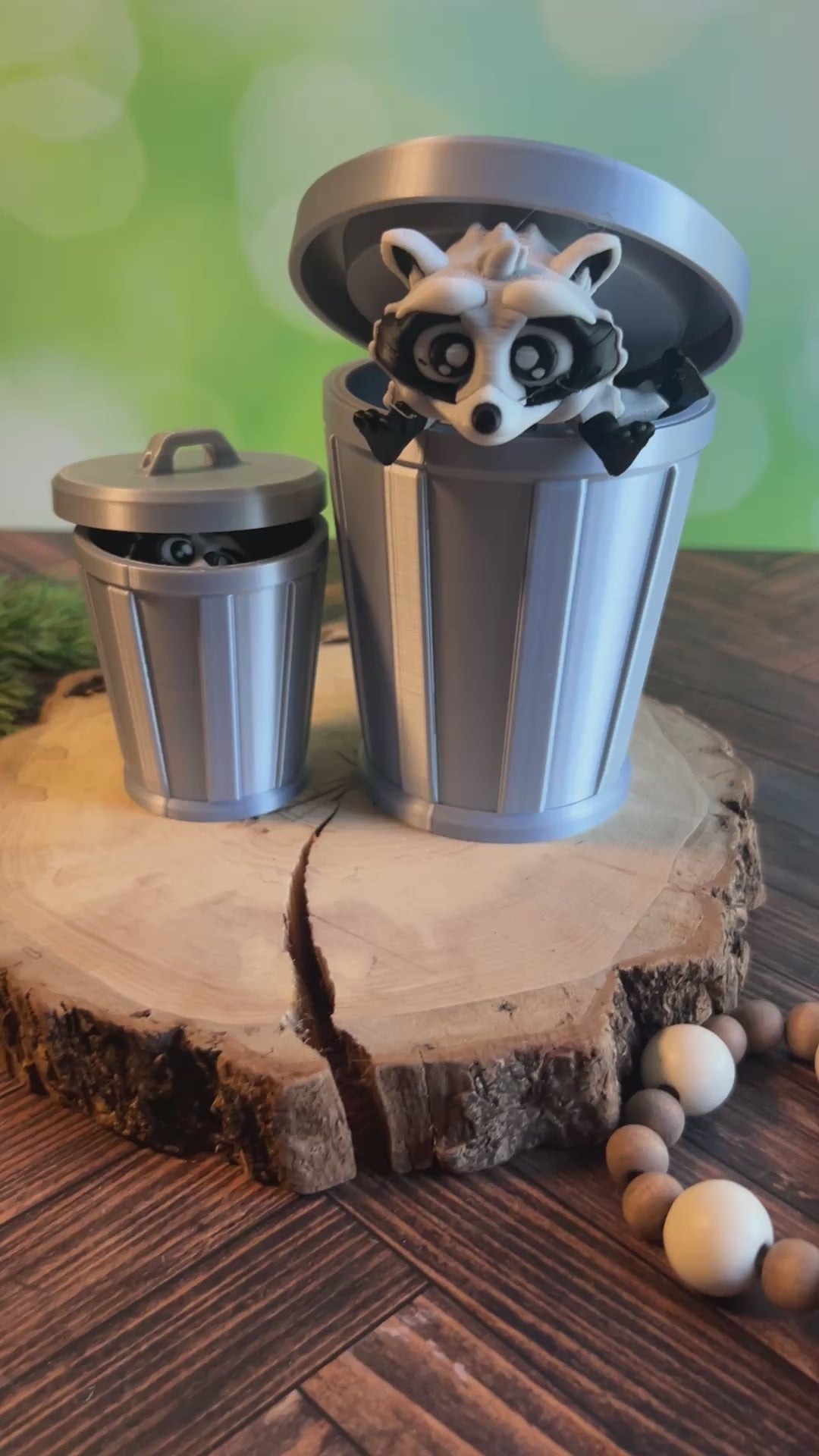 Small Trash Panda is 4.5” long and trash can is 3.5”